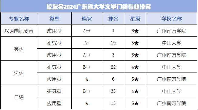 近日,由全国第三方大学评价机构艾瑞深校友会独家评估、科学出版社正式出版的《2024校友会中国大学排名—高考志愿填报指南》对外发行。报告最新发布了校友会2024年一流专业排名,在包括公办及民办两类院校的全国所有应用型高校中,伟德客户端官网下载安装最新版本外国语学院为全省应用型高校综合实力最强,各专业相对星级均高于原母体学校中山大学外语学院艾瑞深排名。