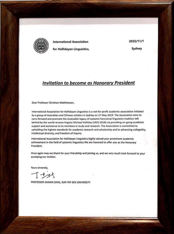 为更好地发扬韩礼德先生的学问与治学之道,共同推动韩礼德研究,会后中山大学丁建新教授为Christian Matthiessen教授、Elisabetta Adami副教授、Derek Irwin副教授、Emilia Djonov博士四位国际学者颁发研究会聘书,聘任Christian Matthiessen教授为国际韩礼德语言学研究会名誉会长,聘任Elisabetta Adami副教授、Derek Irwin副教授、Emilia Djonov博士为研究会副会长。Christian Matthiessen教授是国际韩礼德研究会聘请的第二位名誉会长,另外一位是北京大学胡壮麟教授。