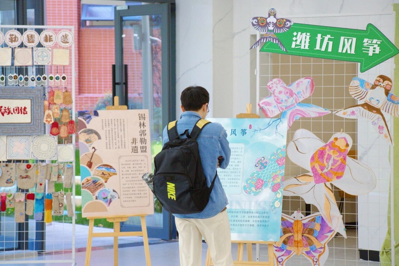 活动期间,博雅学院在图书馆展出非遗教学成果,锡林郭勒盟草原毛毡、丰顺纸花、潍坊风筝等作品悉数呈现。校友们驻足欣赏、频频赞叹,在熟悉的环境里感受文化传承的鲜活脉搏。