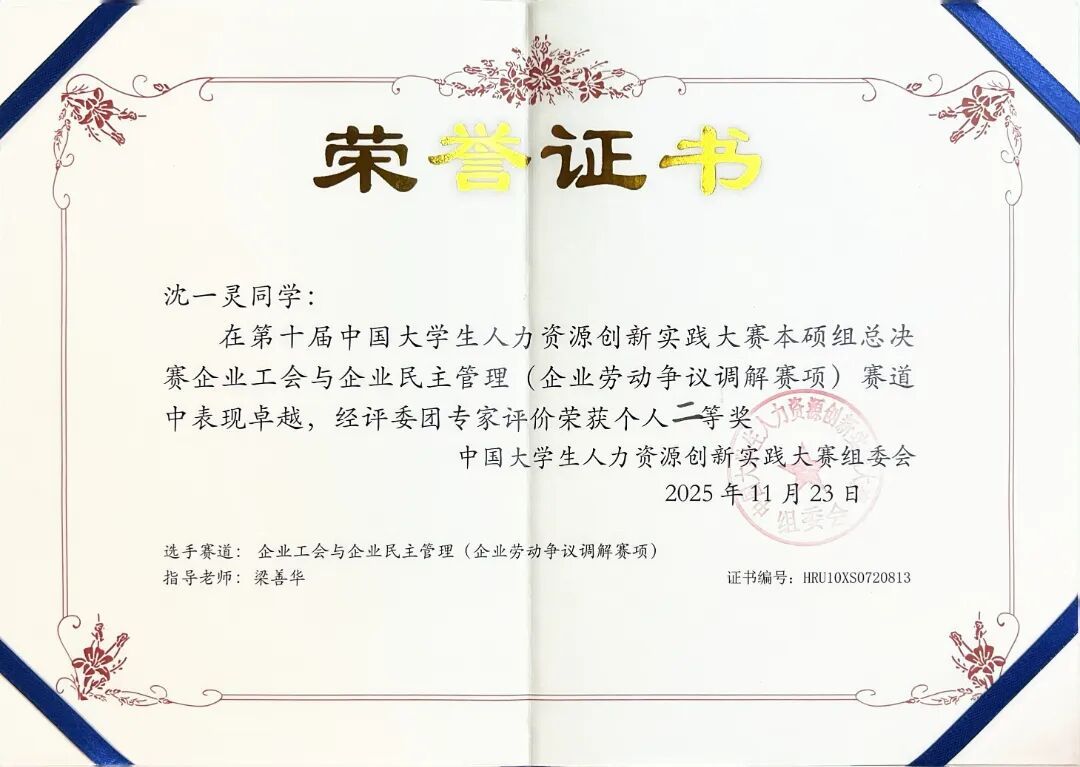 梁善华老师的专业指导下,沈一灵、吴致蘅同学在企业工会与企业民主管理赛道中荣获企业民主管理方案设计一等奖。