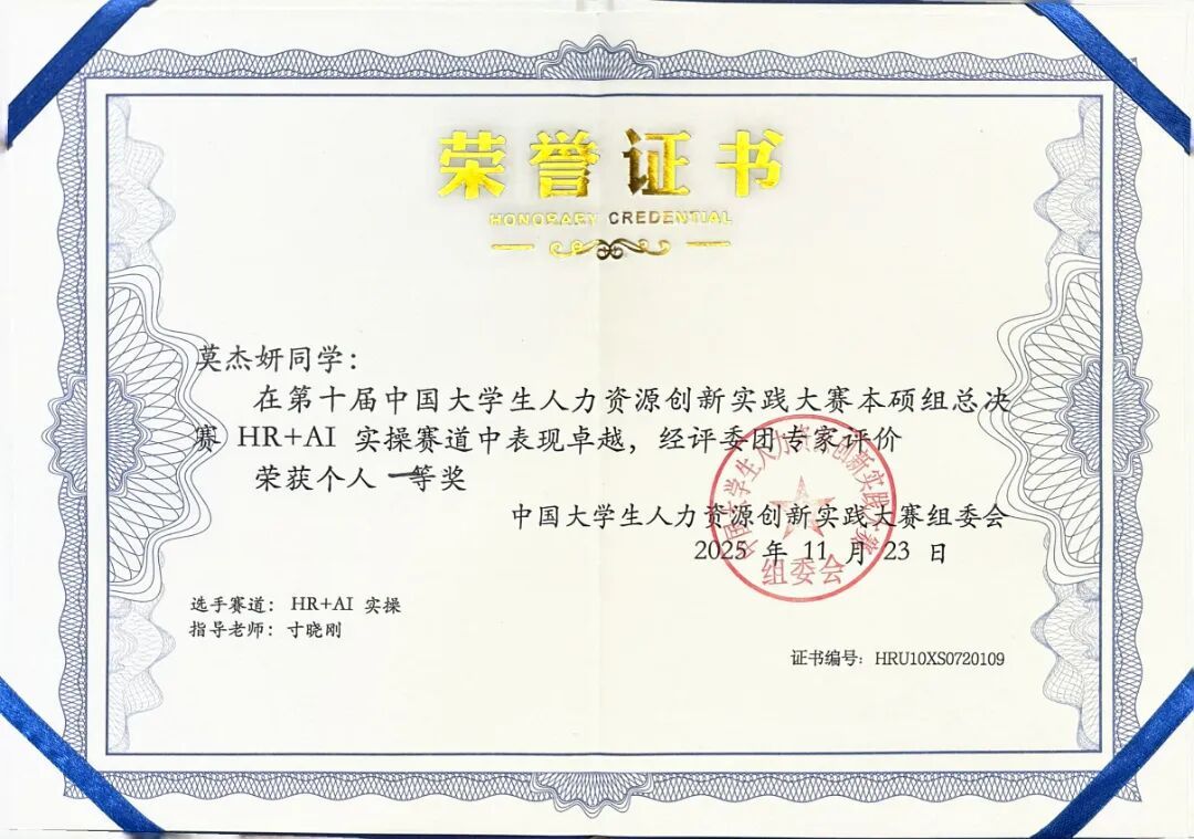 寸晓刚老师的专业指导下,莫杰妍、林烨丽、陈瑞君同学在HR+AI数字化赛道中荣获一等奖