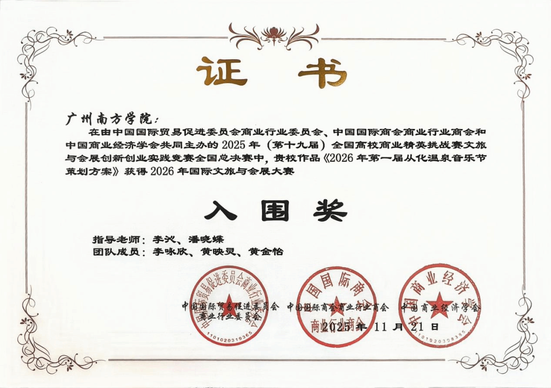 作为本赛事的最高级别竞赛,全国总决赛精英赛汇聚了从全国分组赛中脱颖而出的顶尖团队。我院由队长李咏欣、成员黄映灵、黄金怡组成的“岭南泉韵,从化之声”项目组,以会展项目策划赛道全国50强及我校唯一代表队的身份,赴浙江永康参与角逐,最终荣获精英赛入围奖,展现了南院学子的卓越风采。