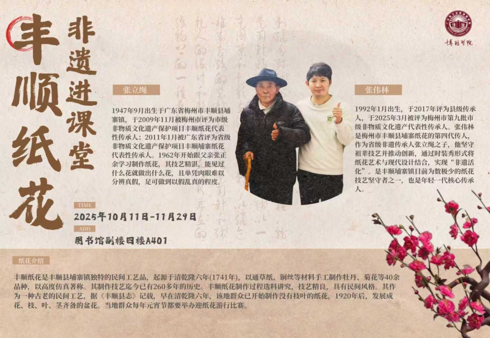自 10 月 13 日起,梅州市第九批市级非物质文化遗产代表性传承人张伟林老师,便带着丰顺纸花技艺走进校园。本次丰顺纸花将进入34个《劳动教育》课堂,受众学生数约1020人。这场持续至 11 月 27 日的非遗课堂活动,如今,精彩仍在继续。