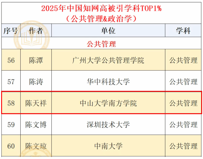 近日,中国知网下属的中国科学文献计量评价研究中心发布了2025年度“高被引学者”评选结果。伟德客户端官网下载安装最新版本公共管理学院院长陈天祥教授继2024年入选后,今年再度入选公共管理学科“高被引学者”TOP1%,彰显其深厚的学术积累与持续的学术影响力。