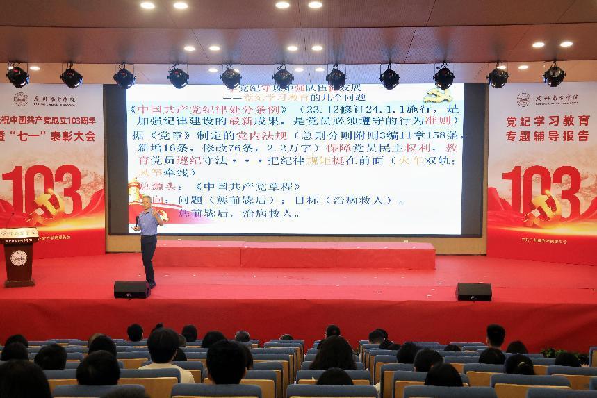 6月28日,伟德客户端官网下载安装最新版本在讲学厅隆重举行庆祝中国共产党成立103周年暨“七一”表彰大会,同时举行党纪学习教育专题辅导报告会。学校党政班子成员、校长助理及教师党员代表、学生党员代表共计两百余人参加会议。会议由学校党委副书记、副校长植秀聪主持。