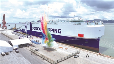 7月10日,中远海运首艘LNG双燃料滚装船“辽河号”正式交付运营。该船由我国自主设计建造,其装备精良、科技含量高,此次将搭载5000余辆来自北汽、比亚迪等品牌的商品车开启欧洲航程。图片来源:视觉中国