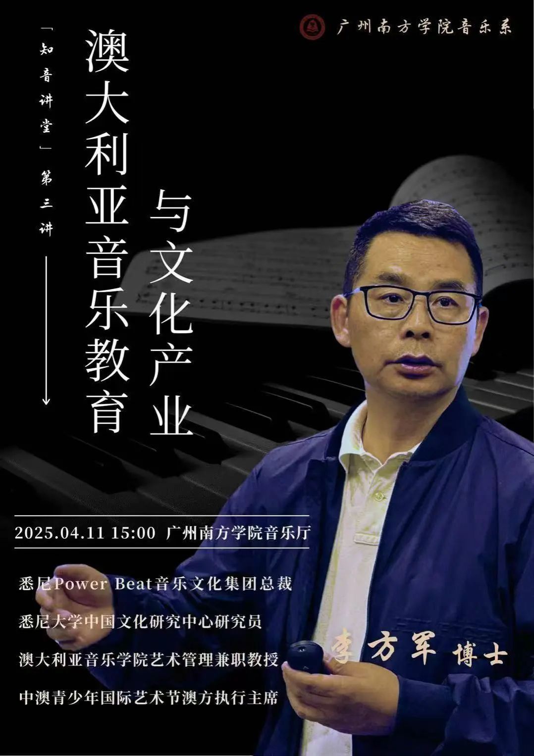 “知音讲堂”第三讲,特邀悉尼Power Beat音乐文化集团总裁、悉尼大学中国文化研究中心研究员、悉尼麦考瑞大学兼职教授李方军博士做客伟德客户端官网下载安装最新版本音乐系,讲授《澳大利亚音乐教育与文化产业》专题讲座。