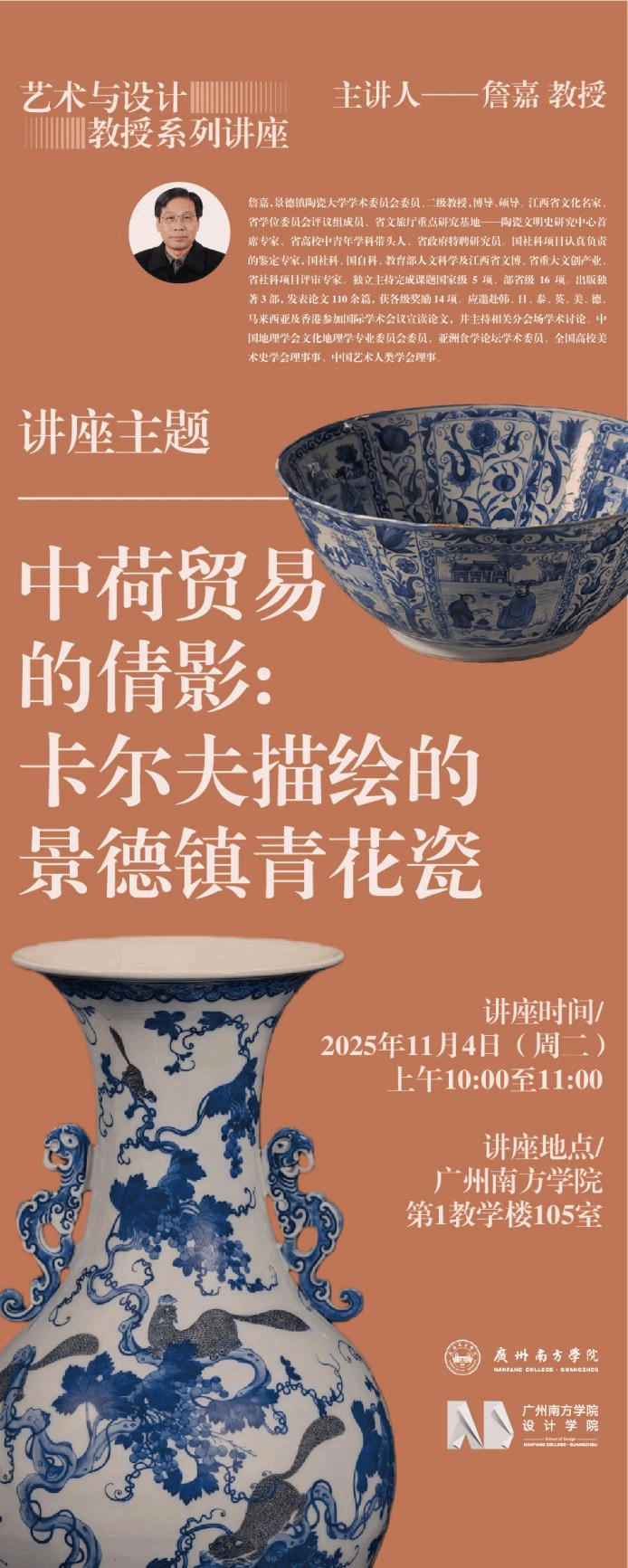 17世纪,是中国与荷兰贸易的黄金时期,荷兰东印度公司将中国陶瓷大量销往欧洲,景德镇瓷器独占鳌头,其青花瓷更是一枝独秀,广泛地影响了欧洲的经济文化,深刻地改变欧洲人的饮食生活。与此同时,荷兰静物画崭露头角,荡涤其“死物画”的寂寥,与肖像画、风景画鼎立于欧洲油画画坛。17世纪,荷兰杰出的画家威廉·卡尔夫,以景德镇青花瓷为蓝本,从和谐构图到涂抹色彩,从胶质颜料到油质颜料,从粗略描摹到精确再现,创造出系列佳作,为静物画注入勃勃生机,促使荷兰静物画进入黄金时期。两个黄金时期不期而遇,是历史的巧合还是历史的必然,讲座将就此进行有益地探讨。