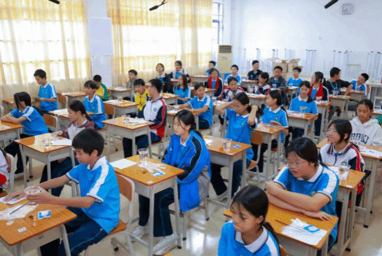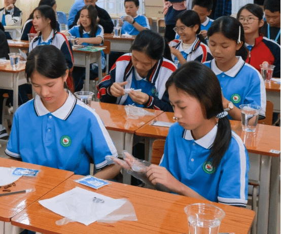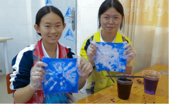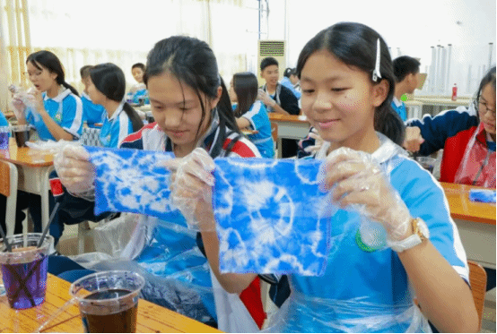 实践环节中,党员志愿者分组带队,发挥专业优势全程指导。他们耐心示范捆扎、缝纫、染色等关键技法,针对不同年龄段学生的特点调整教学方式——为低年级同学简化操作步骤,用卡通图案激发兴趣;为高年级同学讲解图案设计中的文化寓意,鼓励结合现代审美创新创作。吕田中学的同学们热情高涨,在党员志愿者的帮助下,用皮筋束出灵动线条,用木片夹出规整几何,用丝线缝出别致花纹。当一方方蓝白交织的素布在清水冲洗后显露独特纹样时,教室里的惊叹声与欢呼声此起彼伏,党员志愿者适时引导:“每一件作品都是独一无二的,就像每个人都能以自己的方式传承文化,这就是手工的温度,也是传承的意义。”