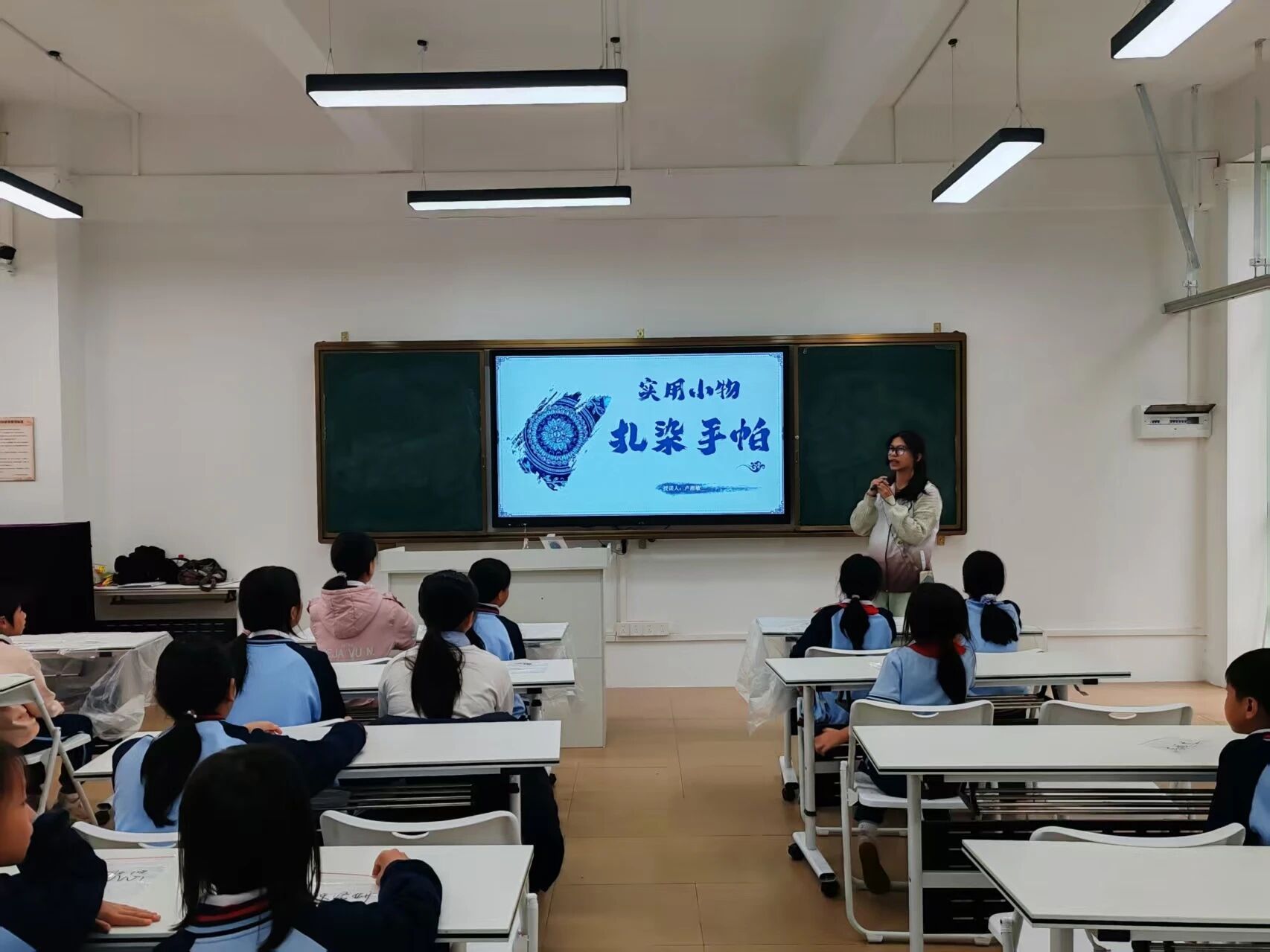 过程中,学生们在小卢老师和小助手的协助下,细心地调整扎结的松紧度,精心制造出独特的图案纹理。随后,大家将扎制好的手帕放入蓝靛染液中泡染,看着素白的布料逐渐晕出浅蓝色、黄绿色、藏青色,不少学生认真地记录上色时间,使其充分上色。待手帕捞出密封,虽无法立刻解开,但也能看出手帕上独特的蓝白肌理。学生们拿着自己的作品,笑脸盈盈,课堂充满了对技艺的骄傲与传承的向往。