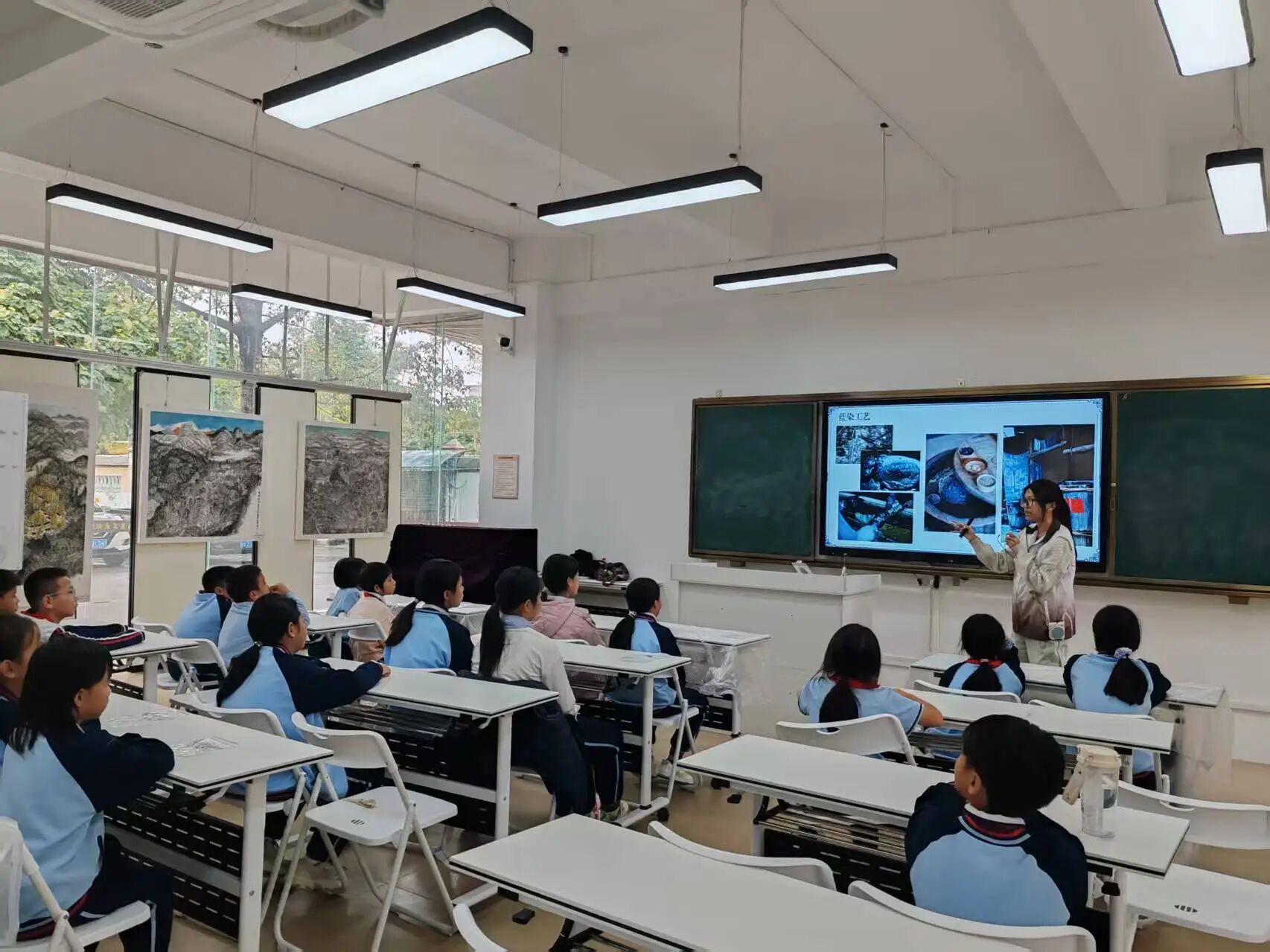 课程以“色彩知识回顾”展开,小卢老师先引导学生梳理上节课学习的色彩组合——从柔和的“友好色”到层次丰富的“惊喜撞色”。随后的“找共同点”环节,小卢老师引导学生们观察扎染作品图,很快总结出“以蓝色为主色调”“图片里都有染缸”的相同点,铺垫了后续扎染工艺的学习。