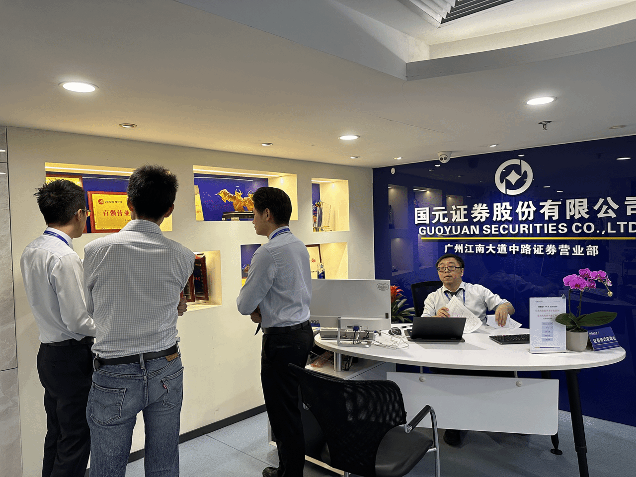 第二站,师生团队前往国元证券广州江南大道营业部。营业部营销总监刘业成、财富顾问练智谋热情接待了师生团队。刘业成总监介绍了营业部的发展历史、核心优势及未来规划,随后带领师生参观了业务大厅、投资者交流区、投研办公区及直播室,深入讲解各区域功能定位与日常业务开展模式。