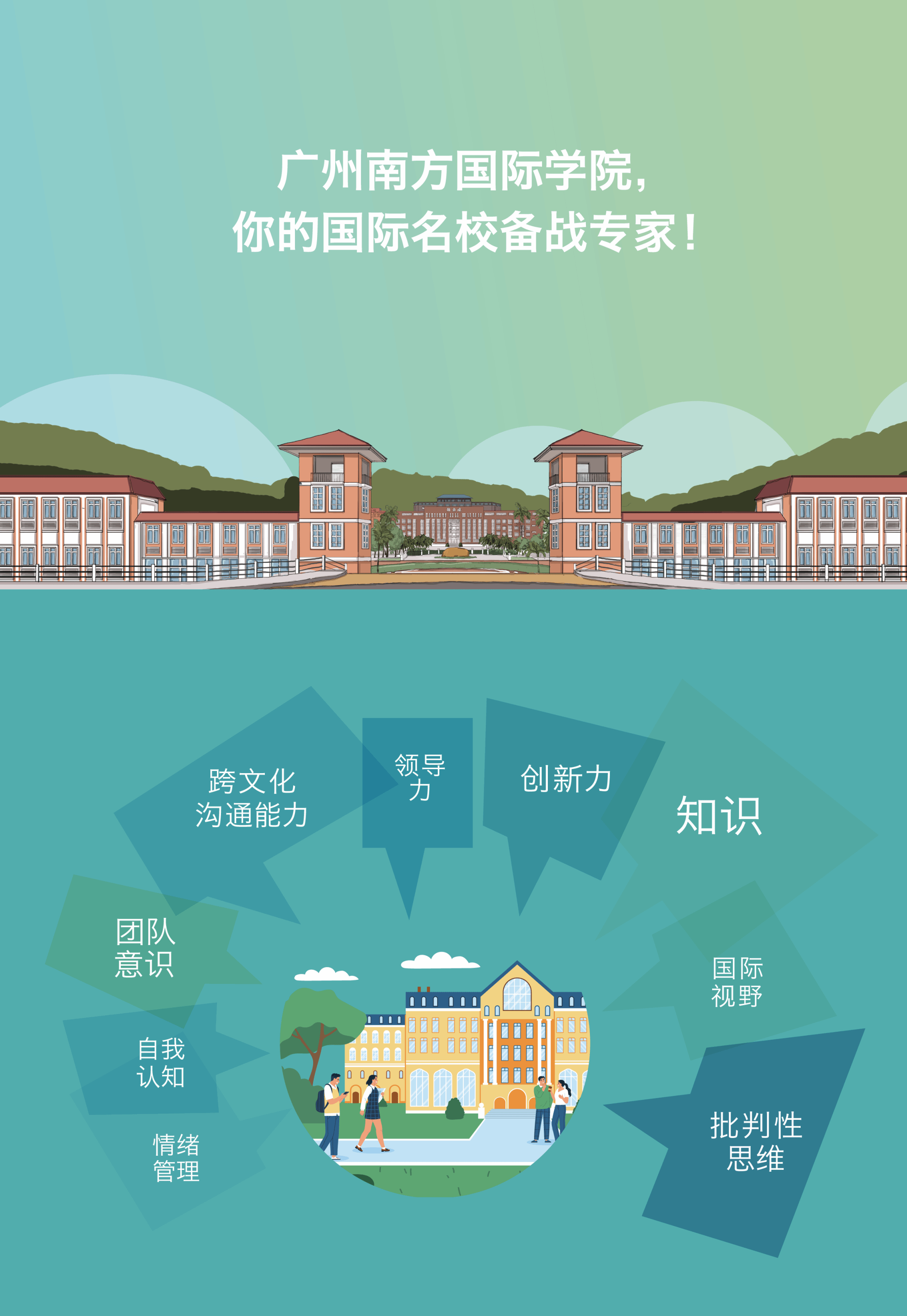 广州南方国际学院运用国际高等教育界最前沿的跨学科创新培养理念,设计适合广州南方国际学院学生发展的课程体系。以创新驱动为指引,以粤港澳大湾区需求为导向,研究领域契合国家战略发展需求,涵盖地方新型产业和未来产业发展方向,追求卓越的教育与研究水平,使之发展成为世界知名的、独具特色的、不断推进中国高等教育国际化发展进程的中国一流学府。